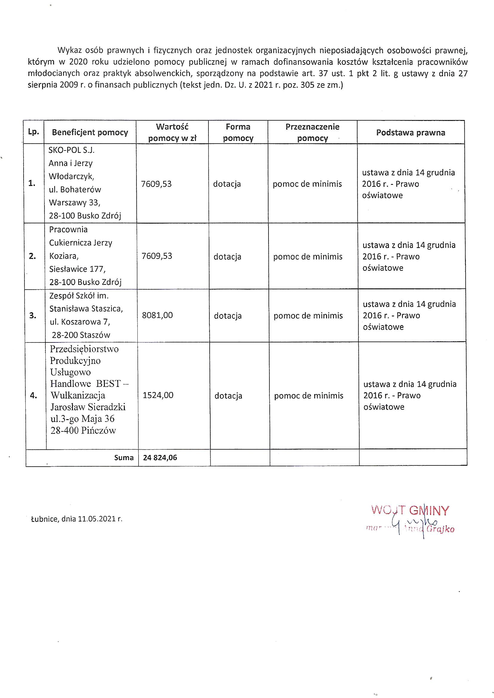 Wykaz osób prawnych i fizycznych oraz jednostek organizacyjnych nieposiadających osobowości prawnej, którym w 2020 roku udzielono pomocy publicznej w ramach dofinansowania kosztów kształcenia pracowników młodocianych
